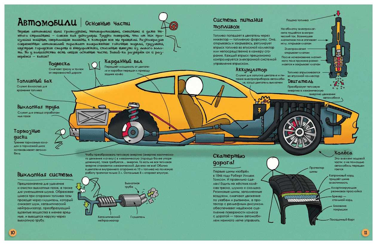 К основным элементам машин (на примере автомобиля) относят двигатель, трансмиссию, шасси и электрооборудование. Двигатель Двигатель — источник механической энергии, который приводит автомобиль в движение. Он преобразует тепловую энергию, образующуюся при сгорании топлива, в механическую. Некоторые компоненты двигателя: Система зажигания — обеспечивает искру для воспламенения топливно-воздушной смеси. Система охлаждения — предотвращает перегрев двигателя. Система смазки — снижает трение между движущимися частями. Система питания (карбюратор, инжектор, топливные насосы) — подаёт топливо в цилиндры. Трансмиссия Трансмиссия — совокупность узлов и механизмов, которые передают крутящий момент от двигателя к ведущим колёсам и изменяют его по величине и направлению. Основные элементы трансмиссии: Сцепление — соединяет двигатель с коробкой передач. Коробка передач — меняет величину крутящего момента, скорость и направление движения колёс. Карданный вал — передаёт крутящий момент на ведущи