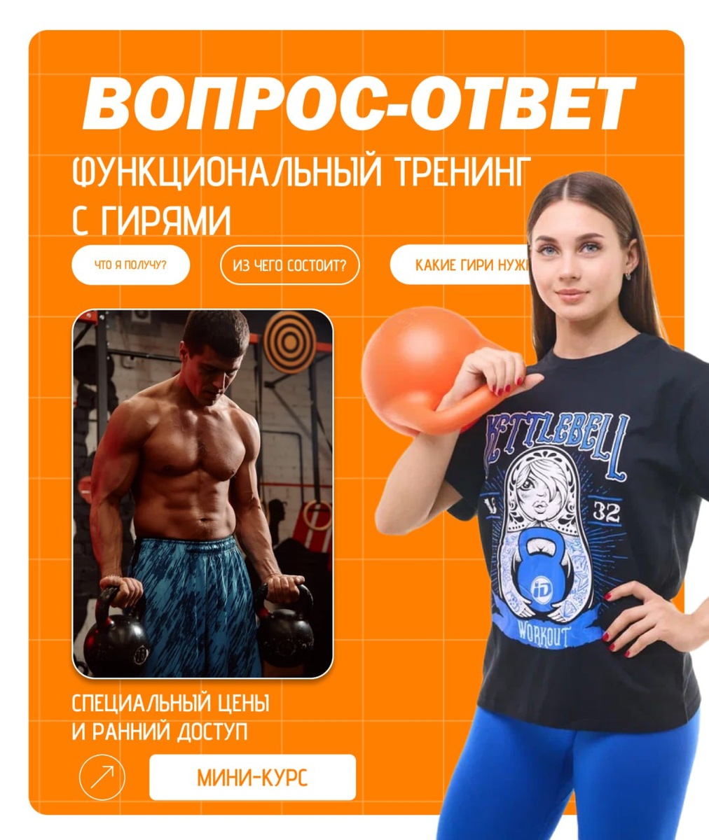Ответы на главные вопросы по курсу🔥 ❓Что я получу, приобретая этот курс? ✅Самое главное, что вы получаете - это чётко составленную программу тренировок, нацеленную улучшение вашей функциональной подготовленности. После прохождения курса ваша "физуха" точно станет мощнее ❓У меня много работы и домашних дел! Сколько по времени будут занимать тренировки и как строится программа? ✅Программа построена следующим образом: тренировки с гирями - понедельник, среда, пятница; кардио-тренировки - вторник, четверг, суббота. Занимают не более 30-40 минут в день вместе со всей подготовкой к самой тренировке ❓Смогу ли я приобрести в рассрочку? ✅К сожалению как таковой рассрочки нет, но...приобретая одно из направлений курса, остальные будут для вас с 50% скидкой Надеемся, что ответили на главные интересующие вас вопросы! Если они у вас всё же остались, то ждём их в комментариях!📝 МИНИ-КУРС УЖЕ В ЛИЧНОМ КАБИНЕТЕ Также не забывайте, что скоро закроется закрытая продажа курса для учеников мини-ку