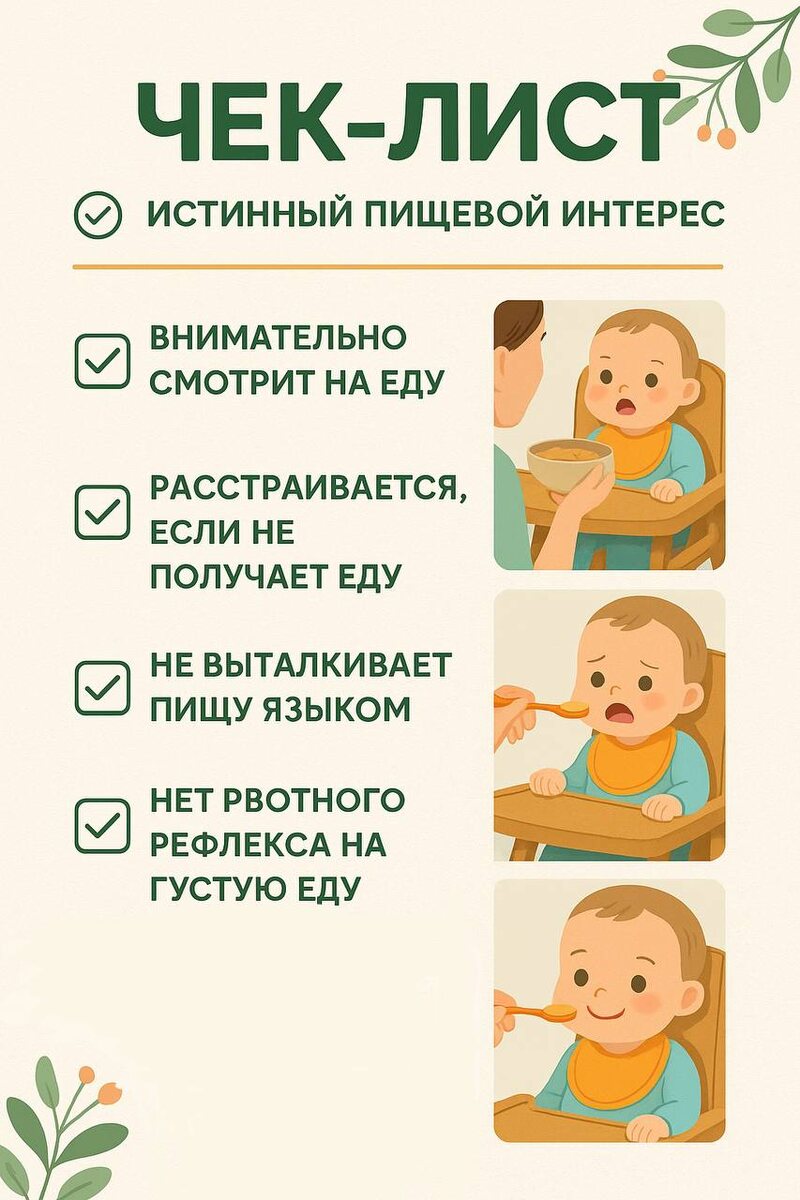 Пищевой интерес - как распознать ??? 🤩🤩🤩🤩🤩🤩🤩🤩 🔻Признаки настоящего пищевого интереса: ☑️Внимание к еде: Ребёнок пристально наблюдает за взрослыми за столом, тянется к их тарелке, хочет попробовать. ☑️Эмоциональная реакция на еду: Если еда попала в рот — доволен; если не дали попробовать — может расстроиться. Важно: интерес именно к еде, а не к ложке без еды! ☑️Отсутствие защитных рефлексов: 🔜Не выталкивает пищу языком. 🔜Не появляется рвотный рефлекс от непривычной текстуры. ❎Что НЕ является пищевым интересом: ➡️Игра с ложкой или еда в качестве игрушки - кидает , размазывает по столу , не тянет в рот. ➡️Отказ от груди или смеси. ‼️Частая ошибка: Малыша не берут за стол — и родители не видят, что он готов к прикорму. Ребёнок нужно с месяцев 4-5 брать с собой за стол , в стульчик , для наблюдения за тем , как все обедают. ➡️Почему не стоит вводить прикорм раньше пищевого интереса: ➡️Риск формирования негативного отношения к еде. ➡️Малыш может стать малоежкой и к 9-10 месяцам