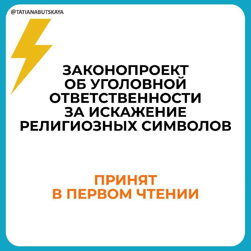 ⚡️Законопроект принят Госдумой в первом чтении Документом предлагается запретить использование изображений культовых зданий, узнаваемых элементов архитектурных сооружений и иных объектов, содержащих религиозные символы, без самих символов. Это касается публикаций в средствах массовой информации, а также рекламы, оформления товаров, а также при использовании в государственных и муниципальных знаках и символике. 👉 Принятие законопроекта должно способствовать формированию уважительного отношения к традициям различных конфессий, проживающих в России, и созданию условий для сохранения религиозной идентичности народов нашей многонациональной страны. В случае вступления закона в силу, искажение религиозной символики в зависимости от обстоятельств будет наказываться штрафом до 500 тысяч рублей либо тюремным заключением на срок до трех лет.