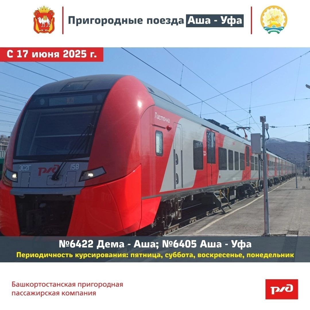 По результатам тестового периода решено сохранить ежедневное курсирование второй пары поездов №6405 Аша – Уфа и №6422 Дёма – Аша. В апреле-мае БППК провела пробный запуск, который показал востребованность такого графика. С 17 июня пригородные поезда на этом маршруте будут ходить по пятницам, субботам, воскресеньям, понедельникам: №6422 Дёма (отпр. 13:27) – Аша (приб. 15:44),