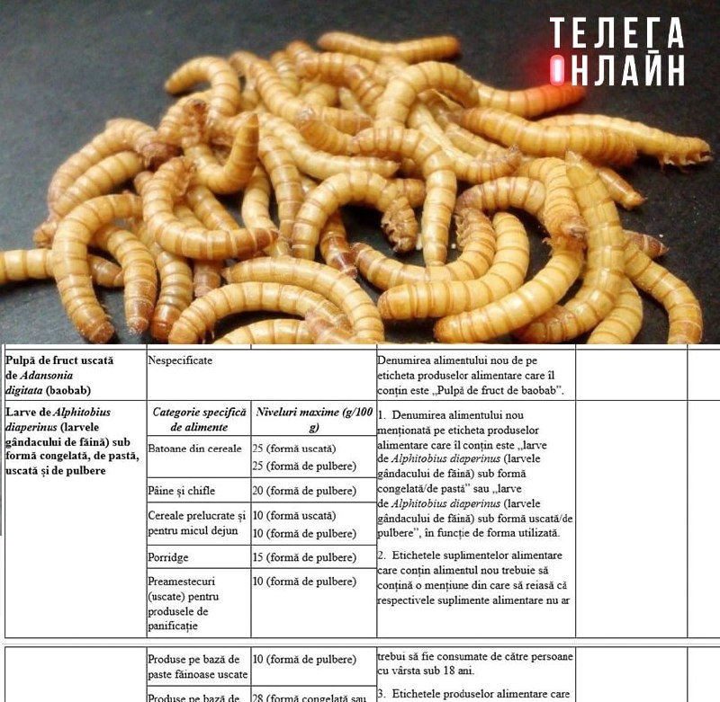 Это уже евроинтеграция или еще нет? Минсельхоз Молдовы внес правки в список продовольственных товаров, добавив в перечень разрешенных ингредиентов личинок мучного жука «в замороженном, пастообразном, сушеном и порошкообразном виде». Документ должен утвердить парламент. Желательно с дегустацией. 🚲 Подпишись на Телега Online