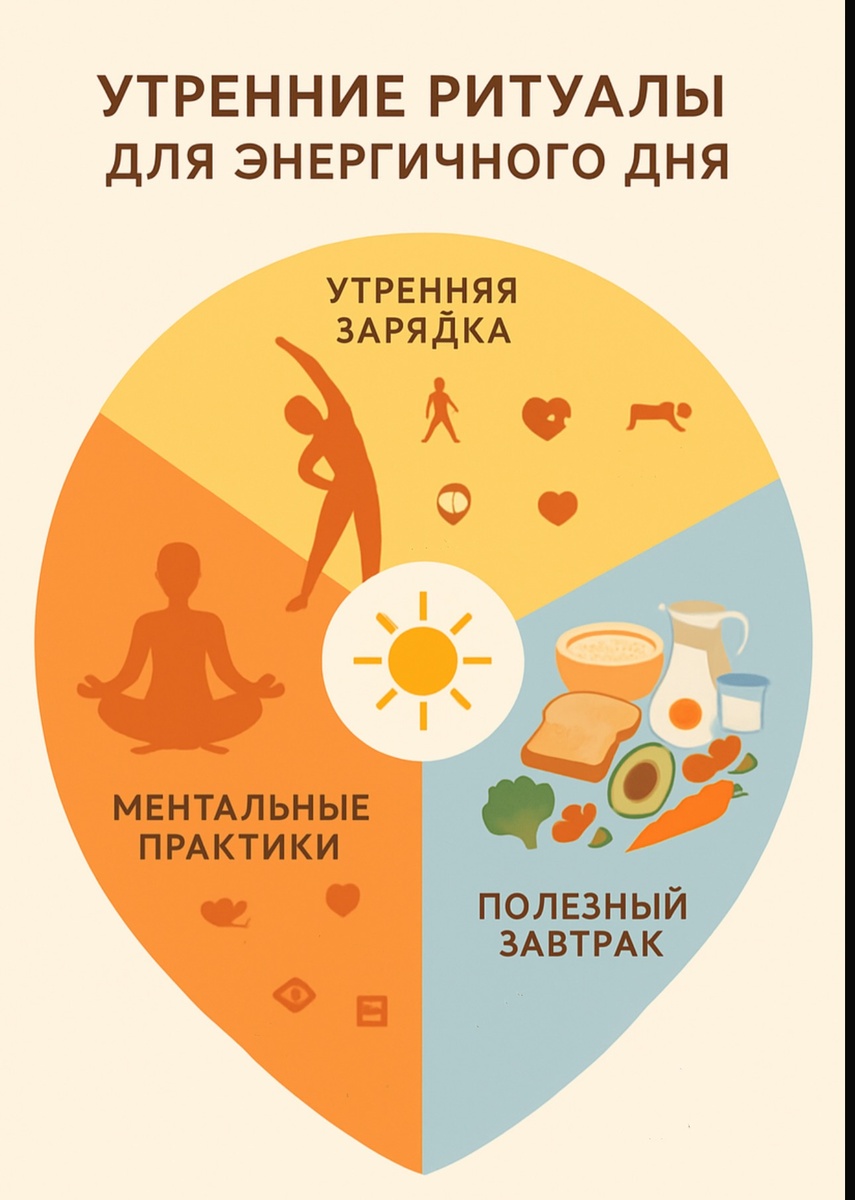 🌞 Доброе утро — залог продуктивного дня! 🌞 Как вы начинаете свой день? Утренние ритуалы — это не просто модный тренд, а научно обоснованный подход к повышению энергии и продуктивности. Правильно организованное утро задает тон всему дню и помогает достичь максимальных результатов. Утренние часы — время, когда наш мозг наиболее восприимчив к формированию новых привычек. Уровень кортизола естественным образом повышается утром, помогая нам проснуться, а правильные практики направляют эту энергию в позитивное русло. Даже 10-15 минут умеренной нагрузки могут значительно повысить уровень энергии благодаря выработке эндорфинов. 1. Глубокое дыхание и растяжка (2-3 минуты) •Сделайте 5-7 глубоких вдохов и выдохов •Потянитесь всем телом, пробуждая каждую мышцу 2. Круговые движения суставами (2-3 минуты) •Начните с шеи и плеч •Продолжите локтями, запястьями, тазом, коленями и голеностопами 3. Легкая кардио-разминка (3-5 минут) •Марш на месте с высоким подниманием колен •Прыжки "звездочка" (д