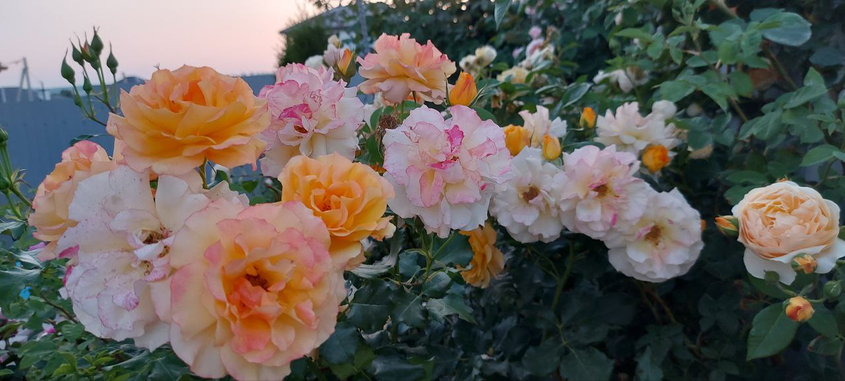 Одно из центральных мест нашего сада занимает роза Сахара. Мы живем в южном регионе и летняя жара для нас нормальное явление. Роза Сахара полностью оправдывает свое название. Горячее солнце ей нипочем. На фоне некоторых роз, цветы которых подпеклись, эта роза радует своим великолепием красок и размера. Это шраб, который можно выращивать кустом или как плетистую розу. В высоту она может достигать трех метров. Наша роза была обрезана весной как обычная кустовая роза, но уже сейчас она выросла до двух метров в высоту. С самого начала цветения и до конца сезона, эта роза постоянно цветет. Цветки насыщенно-желтые, с бледно-оранжевыми тенями ближе к центру – чудесный цвет – затем выгорают до лимонно-желтых или сливочных, в то время как по краям образуется малиновая кайма. В одной цветочной кисти может цвести до пятнадцати цветков, но чаще от шести до десяти. На фото видно, насколько Сахара легче переносит жару по сравнению с некоторыми другими розами. Глядя на цветущий букет, поражаешься,
