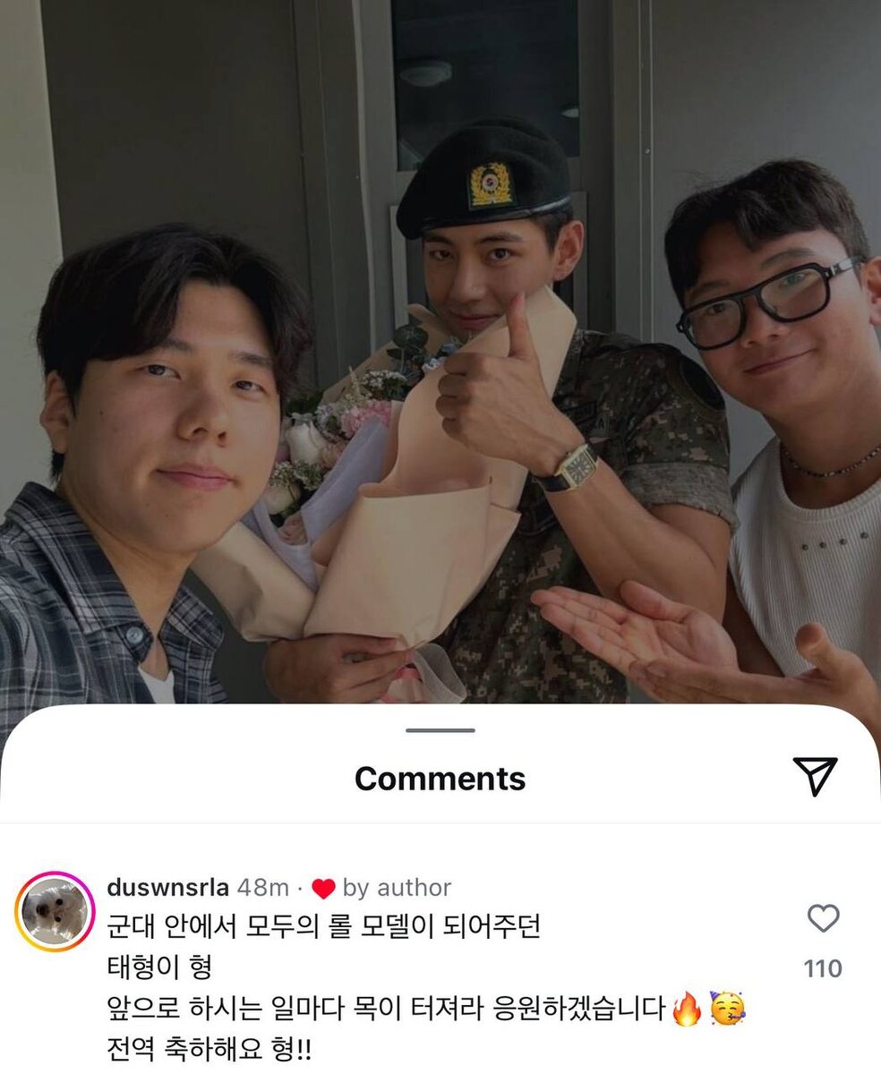 В ответ на пост 🔮 Ещё один товарищ Тэхёна поздравил его с увольнением: Хён, который был образцом для подражания для всех в армии. Я всегда буду поддерживать тебя всем сердцем во всём и во всём, что ты сделаешь в будущем. Поздравляю с увольнением, Хён! #V 🕊️🌸[https://dzen.ru/id/5f3ce54ccaeef80d2efd6e05]🌸🕊️