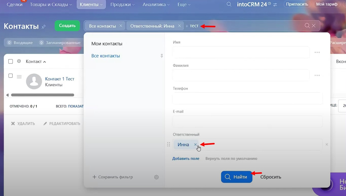 Повторите данный процесс фильтрации по ответственному и выбора нового ответственного для компаний, сделок, и лидов (если используются).