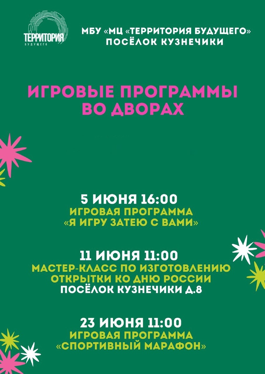 ✨ Игровые программы во дворах в поселке Кузнечики Друзья, 5, 11 и 23 июня состоятся игры для детей во дворах. ⚽🏀🏐 Будет интересно 💫 🏢 г.о. Подольск, поселок Кузнечики 📍https://clck.ru/3MQs6A 🚫 Возраст: 0+ 💰 Вход свободный❗️ #webПодольск ⭐Разместить публикацию ⭐Поддержать канал голосом ✅ Мероприятия Подольск https://dzen.ru/id/66ed500f7b5671493eca3fd6 http://vk.com/podolsk_events http://dzen.ru/podolsk_events