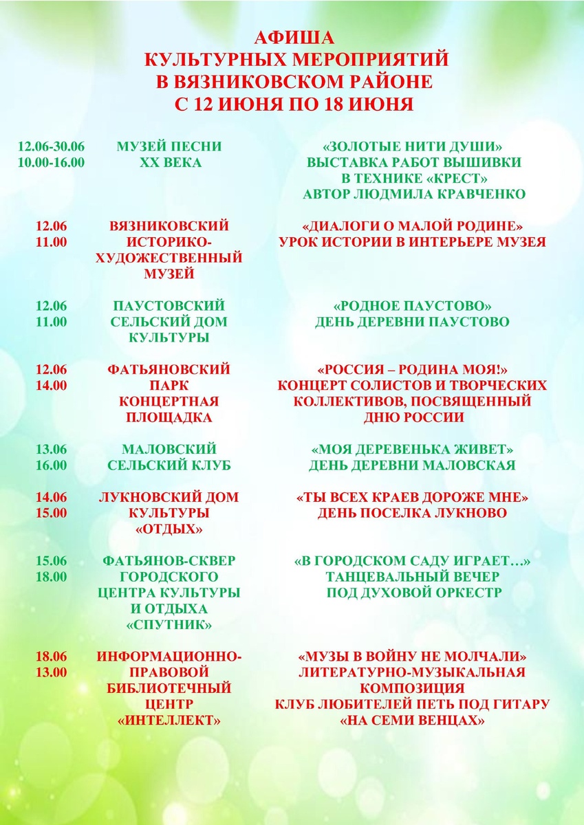 Специалисты Управления культуры и молодежной политики подготовили афишу культурных мероприятий, которые пройдут с 12 по 18 июня