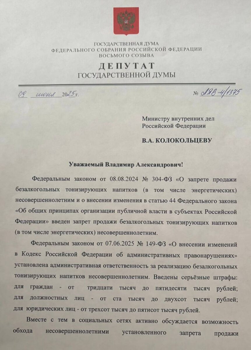 📩Направила обращение министру внутренних дел России Владимиру Колокольцеву с просьбой обратить внимание на продажу несовершеннолетним мороженого с содержанием кофеина и таурина.