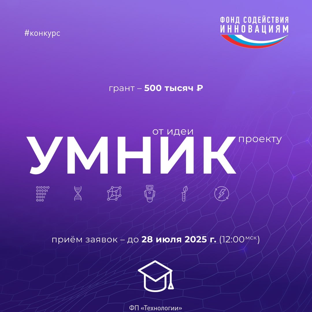 📢Новость дня: «УМНИК» возвращается! Фонд содействия инновациям дал старт конкурсу «УМНИК-2025». ФСИ отобрал 17 площадок конкурса из 7 федеральных округов. Технопарк «Жигулёвская долина» вновь проведёт отборочный этап конкурса «УМНИК». Программа «УМНИК» поддерживает молодых учёных, которые стремятся реализоваться через инновационную деятельность, а также стимулирует участие молодёжи в научно-технической и инновационной деятельности и к созданию малых инновационных предприятий, необходимых для коммерциализации результатов научных разработок. Конкурсные направления: ✅цифровые технологии ✅медицина и технологии здоровьесбережения ✅новые материалы и химические технологии ✅новые приборы и интеллектуальные производственные технологии ✅биотехнологии ✅ресурсосберегающая энергетика Страница конкурса ❗Подробную информацию по конкурсу можно получить в региональном представительстве ФСИ в технопарке «Жигулёвская долина»: Наталья Стрелкова, тел. +7 (8482) 93-00-93 (доб. 932), e-mail: strelkova