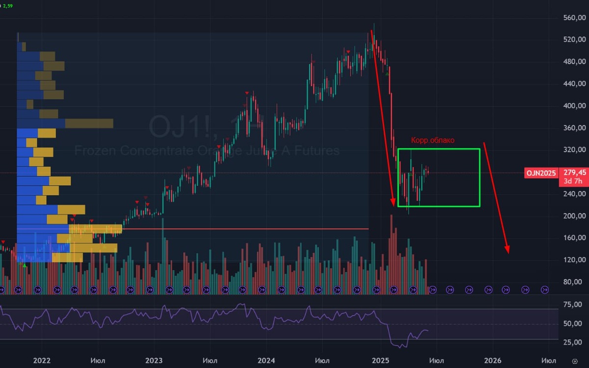 🧃 #Апельсиновыйсок #OJ #bogdanoffinvest 🟢 Мосбиржа запустила торговлю замороженным концентратом апельсинового сока как раз после его сильного падения на 60% с января. Вот где можно порезвиться круче чем в газ. Только для экстремалов первого уровня! 🟢Тренд ненаправленный, находимся в коррекционном облаке, что усложняет торговлю. С большой вероятностью после формирования этой коррекции буду ждать сок вниз, туда, где основная ликвидность. Скорее всего упадем туда на рецессии, по причине того, что всем будет не до сока. Но после сильного падения будет новый этап продолжительного роста!