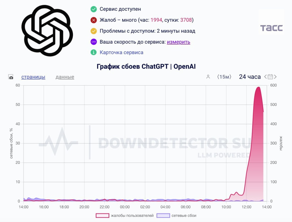 Пользователи в ряде стран сообщают о сбоях в работе ChatGPT. Согласно сведениям Downdetector, сбои фиксируются в Великобритании, Германии, Индии, Италии, США, Японии и других странах.
