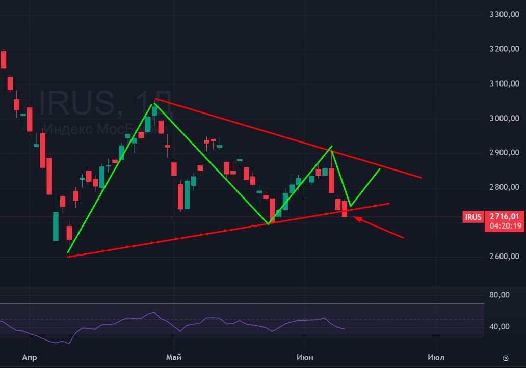 🏦 Индекс Мосбиржи: треугольник разрушен 🟢 Если Вы смотрели вчерашнее вечернее видео, то там я нарисовал треугольник, который предложили подписчики. Так вот, он поломался. Так что остаюсь при своем треугольнике, в котором тест треугольника немного перегнули за счет больших плеч, выданных физикам и за счет перестановок Сбера вверх. 🟢 Или, как вариант, это всё поджатие, а не треугольники. 🚗 В Целом это всё аксиома Эскобара. Какой вариант тут не нарисуй, все они ведут вниз на прилет черного лебедя. #индекс #рубль #индексмосбиржи #ММВБ #IRUS #MXI #MIX #IMOEXF #bogdanoffinvest