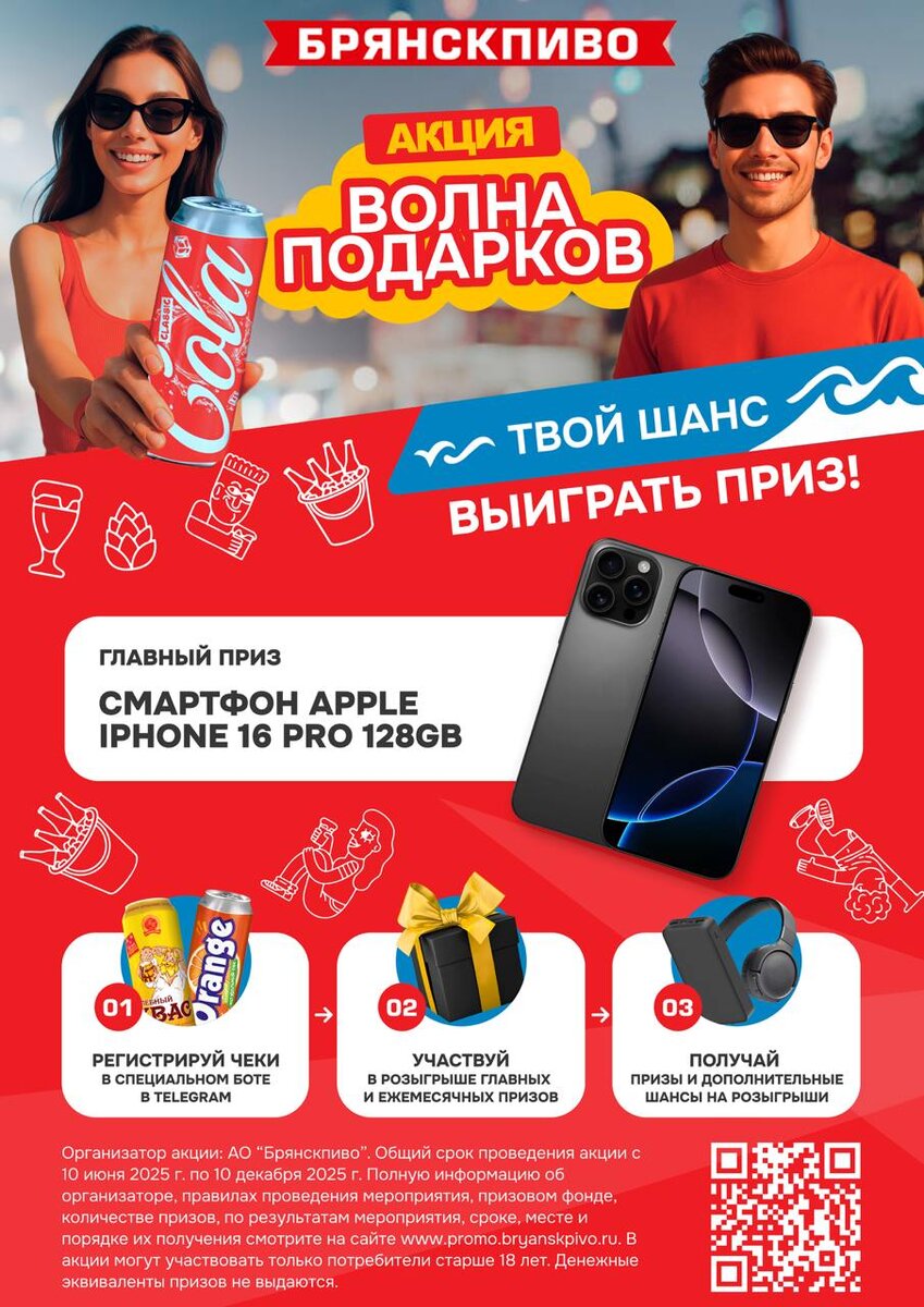 🌊 Пей. Играй. Побеждай. Включайся в новую акцию «Волна подарков»! 🎉 Подробности на сайте: promo.bryanskpivo.ru 📲 ⠀ С 10 июня по 10 декабря 2025 года — участвуй в масштабной акции от «Брянскпиво» и становись счастливым обладателем классных призов! ⠀ 🎯 Впереди — месяцы ярких эмоций, драйва и крутых розыгрышей. А в финале — главный приз: iPhone 16 Pro. ⠀ 💡 Как принять участие: 1⃣ Зарегистрируйся в Telegram-боте 👉 @bryanskpivo_info_bot 2⃣ Покупай любимые напитки 3⃣ Загружай чеки и следи за розыгрышами ⠀ 🍹 В акции участвует линейка продукции — от легендарного Кваса «Хлебный» до безалкогольных напитков bp®Cola, Orange, Bright и безалкогольного игристого «bp®Chardonnay sparkling rose». ⠀ 🎁 Первые победители будут определены совсем скоро! Не упусти шанс — всё только начинается! ⠀ АО «Брянскпиво» — освежайся и побеждай!