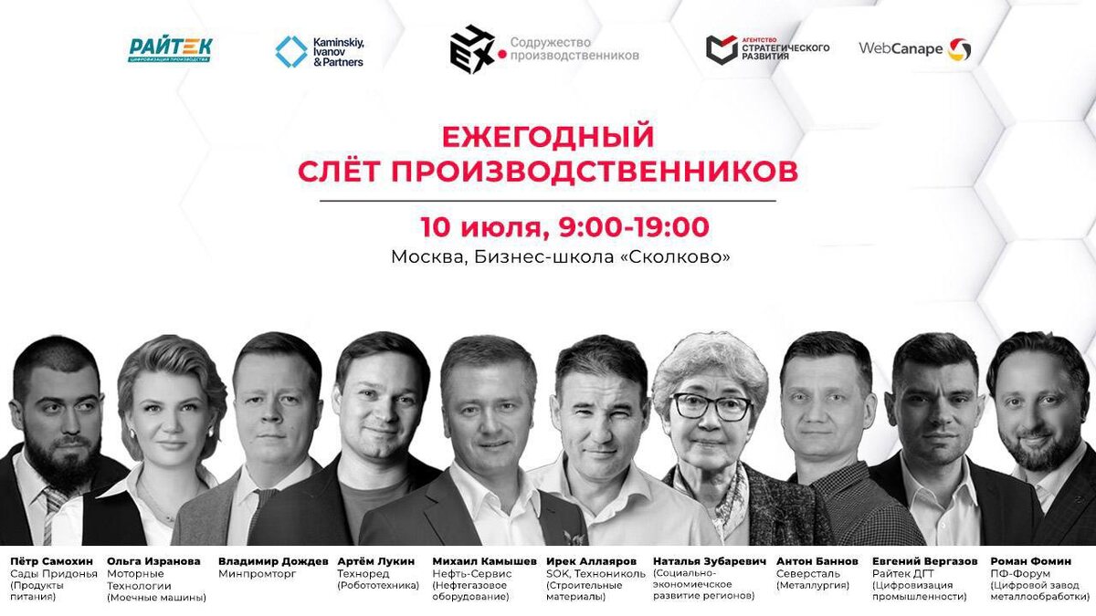 Время объединяться: Слёт производственников уже скоро 📅 10 июля в бизнес-школе «Сколково» соберутся более 100 собственников и руководителей производств со всей России. Это не формальная конференция, а точка опоры — честный обмен опытом, живые кейсы, работающие решения и обсуждение ошибок без фасада. Что вас ждёт: — опыт реальных производственников и стратегии от коллег из разных отраслей — кейсы по оптимизации производства, продаж, привлечению кадров и внедрению технологий — конкретные тактики на ближайшие месяцы — открытый разговор о том, что на самом деле происходит на рынке Среди спикеров: Петр Самохин — Сады Придонья Евгений Вергазов — Райтек ДТГ Ирек Аллаяров — SOK, экс-ТЕХНОНИКОЛЬ Антон Баннов — Северсталь Ольга Изранова — Моторные технологии Роман Фомин — ПФ-Форум Артем Лукин — TECHNORED 🔗 Подробности и регистрация: tcech.ru/meeting_production_workers До встречи на Слёте — вместе создадим будущее производства.