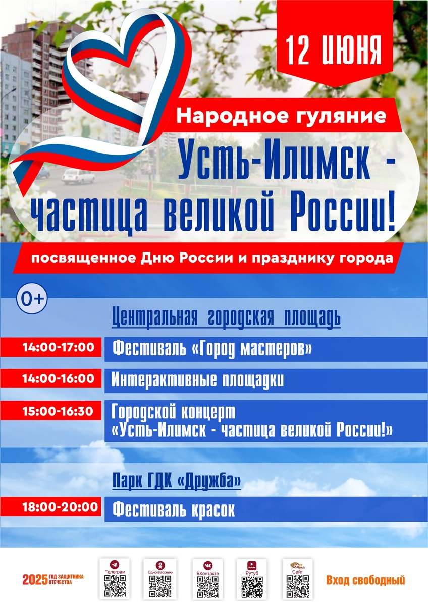 Дорогие устьилимцы! Приглашаем вас 12 июня, в День России и День города, на народное гуляние “Усть-Илимск – частица великой России”. ▶️ Центральная городская площадь: 🕑 14.00 – 17.00 – Фестиваль “Город мастеров”. 🕑 14.00 - 16.00 – Интерактивные площадки. 🕒 15.00 – 16.30 – Городской концерт. ▶️ Парк ГДК “Дружба”: 🕕 18.00 – 20.00 – Фестиваль красок. Краску можно приобрести в кассе ГДК "Дружба", тел. 8-(395-35)-5-31-59.