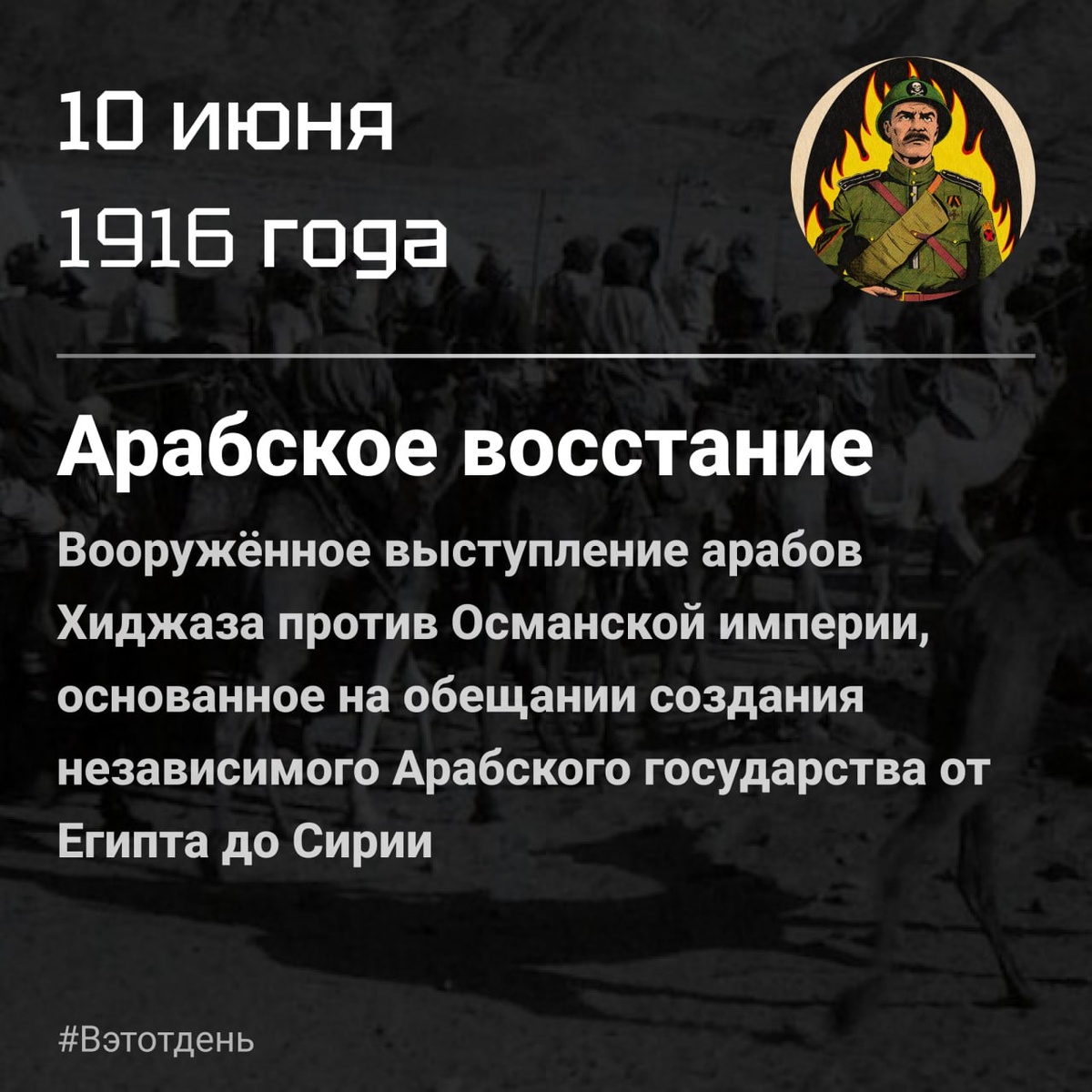 Летом 1916 года шериф Мекки Хусейн бен Али поднял Арабское восстание — вооружённое выступление арабов Хиджаза против Османской империи. Официальная дата — 10 июня 1916 года, когда Хусейн сделал выстрел из личного ружья после утреннего намаза в Мекке, тем самым дав сигнал к восстанию. Основанный на обещании создания независимого Арабского государства от Египта до Сирии (на основе «Корреспонденции Мак‑Магон — Хусейн»), восстание сплотило мусульманские племена под его началом и поддержкой Британской армии. В июне–июле под ударами сил Хусейна и его сыновей были захвачены такие ключевые города, как Мекка, Джидда и Янбу, а также начата осада Медины . Его сыновья, Али и Фейсал, возглавили атаки на Медину уже с 5 июня, в то время как шериф подал сигнал к восстанию именно 10 числа. К осени восставшие достигли численности до 30–50 000 человек, расширяясь по территории Аравии и провинциям на Красном море . К середине 1917 к ним присоединились десятки британских технических и разведывательных по