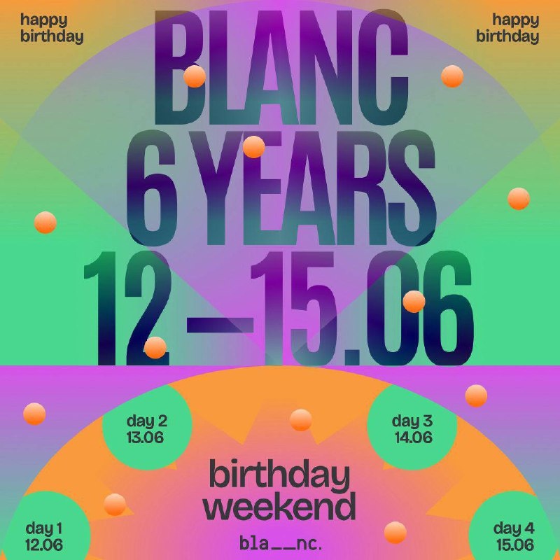 BLANC 6 YEARS | 12-15 июня На долгих праздничных выходных московский Blanc отмечает свой шестой День Рождения. В этом году окончательно забыто понятие «умеренность», клуб устраивает четырёхдневный фестиваль удовольствия, красоты и культурного безумия. DAY 1: 12.06 — препати в кругу друзей, которые уже вписали себя в историю этого места не по долгу, а по любви Liza Yamskova / Anton Beznosuk / Denis Kurchenko George Topuridze / Mashkov / IZHEVSKI / Mike Spirit & more TBA DAY 2: 13.06 — танцы под открытым небом, маркет, чтобы побаловать своего внутреннего ребёнка, неожиданные приятные активности и калейдоскоп развлечений Dima Safronov / Valera Melman / Romey Eighteen (live) / DFF (DJ ARTIK, SPAIDA, LIL DEN) ТРАВМА (club show) / Kovyazin D / Pachino & more TBA DAY 3: 14.06 — тотальное веселье, музыкальное разнообразие, неочевидные активности DAY 4: 15.06 — планируется бранч с барбекю и за бокалом игристого обсудим прошедшие праздники под музыку любимых артистов Подробности программы
