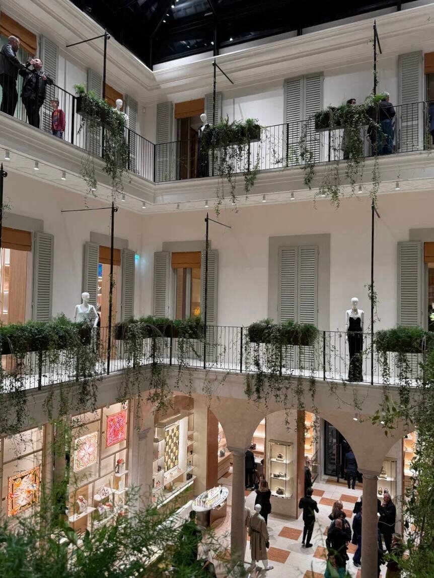 Три года реставрации — и пространство французского бренда, отреставрированное американским архитектором, открылось на исторической итальянской улице Монтенаполеоне. Оно вдвое больше первоначального варианта и звучит громко даже вне контекста моды: Палаццо Таверна — здание XIX века с неоклассическим фасадом, колоннами и арочным входом. Исторический подтекст заложен даже в отделку: местная древесина и 15 разновидностей минералов — в том числе желтый мрамор Giallo di Siena, яркий и необычный камень из итальянских карьеров. Лестница — и вовсе отдельная часть композиции. Ее дизайн вдохновлен виллой Некки Кампильо и спроектирован покойным Пьеро Порталуппи. Но кое-что для бутика сделали уникальны — например, шахматный узор с отсылкой к Damier в отделке из лакированной пергаментной кожи. В подвале — мужские коллекции и восстановленные старинные своды Первый этаж — обувь под потолком с лепниной, вдохновленной миланскими парадными, и отдельная комната с женской одеждой в духе Casa Corbellini-Wa