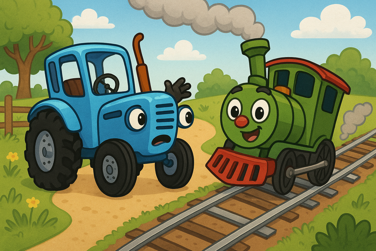 На весёлой зелёной ферме, где в пруду поют лягушки, а поросята катаются в грязевых лужах, жил Синий Трактор. Он был не только помощником фермера, но и настоящим другом для всех. С утра до вечера он ездил по полям, пел весёлые песенки и помогал на огороде, в сарае и везде, где нужна была помощь. Недалеко от фермы проходили рельсы. По ним катался маленький, но очень весёлый паровозик по имени Пар-Пых. Он был новым на линии, только недавно прибыл на станцию, и был страшно любопытным. Каждое утро он бодро гудел: — Пых-пых! Ту-ту! Я весёлый паровозик, я по рельсам мчусь как ветер! Синий Трактор дружил с ним, хотя иногда у Пар-Пыха случались... шалости. Но однажды случилось нечто, что перевернуло весь день с ног на колёса! Глава 1. Неожиданный побег Утром Синий Трактор ехал к огороду, когда вдруг услышал странный гудок. Он обернулся — и увидел, как по лугу, не по рельсам!, несётся Пар-Пых. — Ту-туууу! Я свободный паровозик! — кричал тот. — Теперь я могу ехать, куда хочу! — ПАР-ПЫХ! СТОЙ! — з