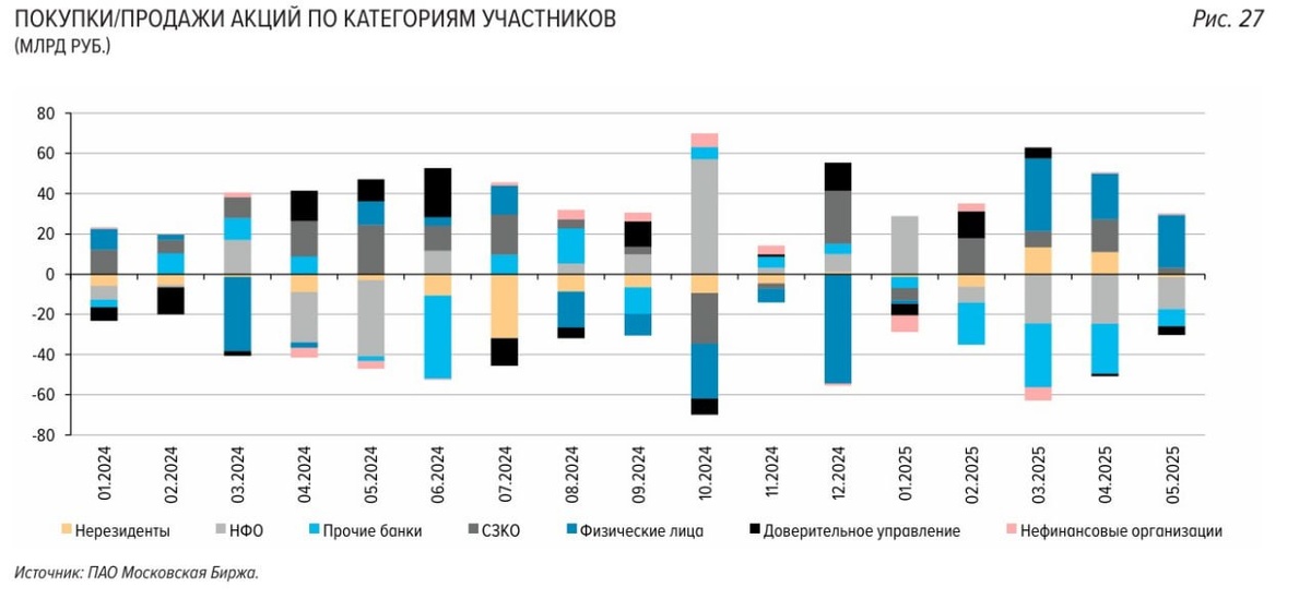 Акции в мае Кто покупал, кто продавал "Обзор рисков финансовых рынков" Май 2025г https://cbr.ru/Collection/Collection/File/55957/ORFR_2025-5.pdf Доля физ. лиц в объёме торгов стабильно 75% Крупнейшими нетто-покупателями в мае по-прежнему оставались физические лица, купившие акций на сумму 26,1 млрд руб. (в апреле – на 22,7 млрд руб., с начала года – 83,4 млрд руб.). Помимо них, небольшие нетто-покупки совершили банки, входящие в перечень системно значимых: в мае они приобрели акций на сумму 3,3 млрд руб., что значительно ниже показателей апреля – 16,3 млрд руб. (рис. 27). Основными нетто-продавцами, как и месяцем ранее, были НФО (нефинансовые организации) рамках управления собственными средствами: они продали акций на 15,9 млрд руб. (в апреле их продажи были значительно выше и составляли 24,8 млрд руб.). Банки, не относящиеся к СЗКО (СЗКО - это системно значимые кредитные организации) также продолжили продавать бумаги, нетто-продажи в мае составили 8,6 млрд руб. в сравнении с 24,