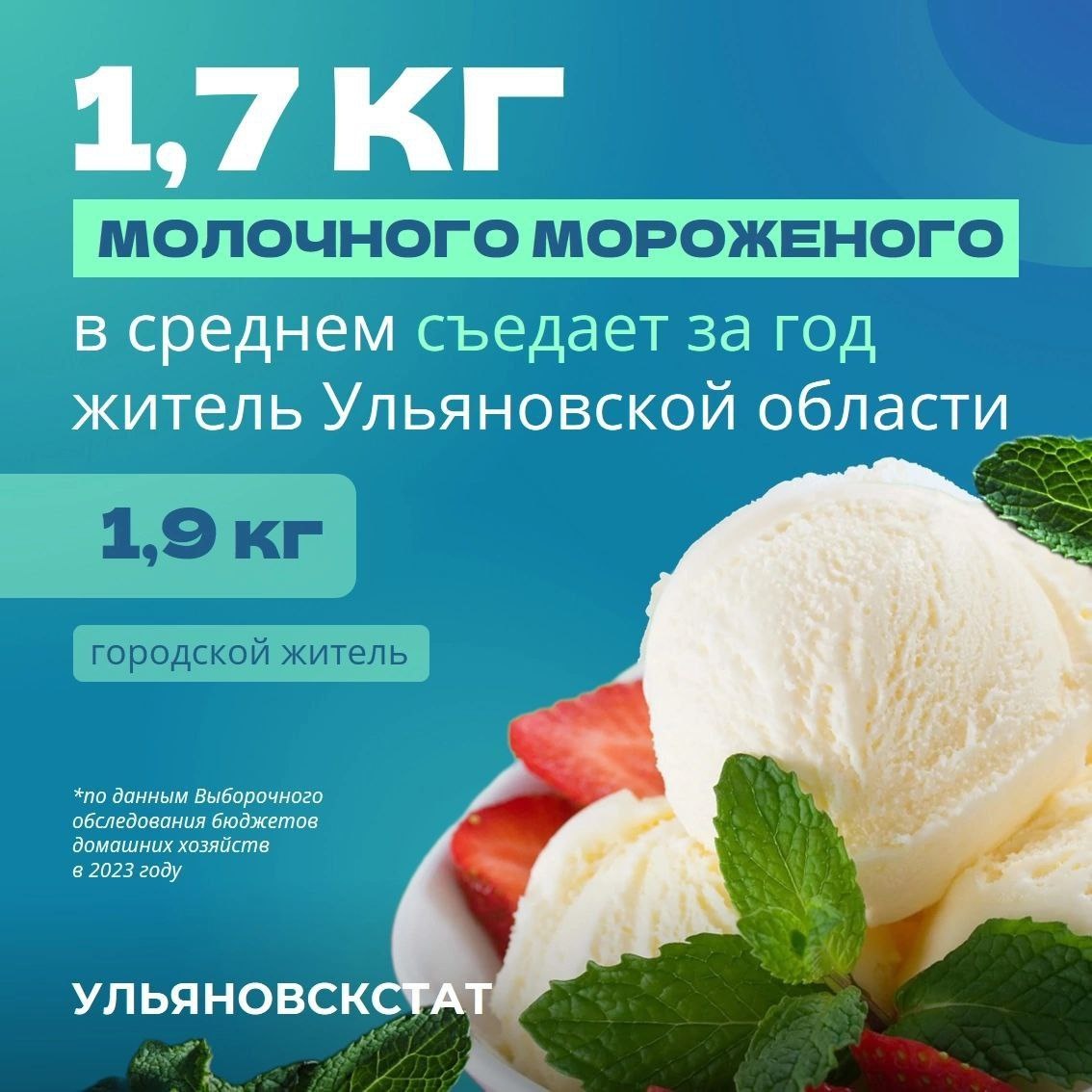 В среднем за год ульяновец съедает 1,7 кг молочного мороженого Ульяновскстат сообщает, что среди горожан любителей экскимо и пломбира больше: в год они съедают по 1,9 кг.* 🍧А вы знали? При дегустации мороженого используют приборы из чистого золота! У ложек из этого металла нет собственного вкуса и запаха *По данным Выборочного обследования бюджетов домашних хозяйств в 2023 году