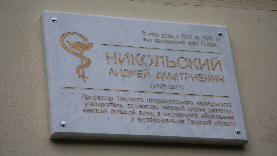 15 июня в России отмечается День медицинского работника. Накануне профессионального праздника в Твери установили мемориальную доску профессору Тверского государственного медицинского университета Андрею Дмитриевичу Никольскому. Памятная табличка установлена на фасаде дома №1г по Свободному переулку, где жил профессор. В торжественной церемонии принял участие председатель Тверской городской Думы Евгений Пичуев. Андрей Никольский приехал в Тверь 1970 году, работал хирургом в одной из городских больниц. Защитил кандидатскую и докторскую диссертации и принял непосредственное участие в становлении Калининского медицинского института, организовав кафедру урологии. - Это был талантливый врач и ученый, который основал настоящую школу урологии. Такое удается немногим, - отметил бывший ректор Тверской медицинской академии, президент Фонда Екатерины Бакуниной Михаил Калинкин. – Размещая мемориальные доски, мы сохраняем в истории имена выдающихся людей, которые представляют собой явление. Андрей