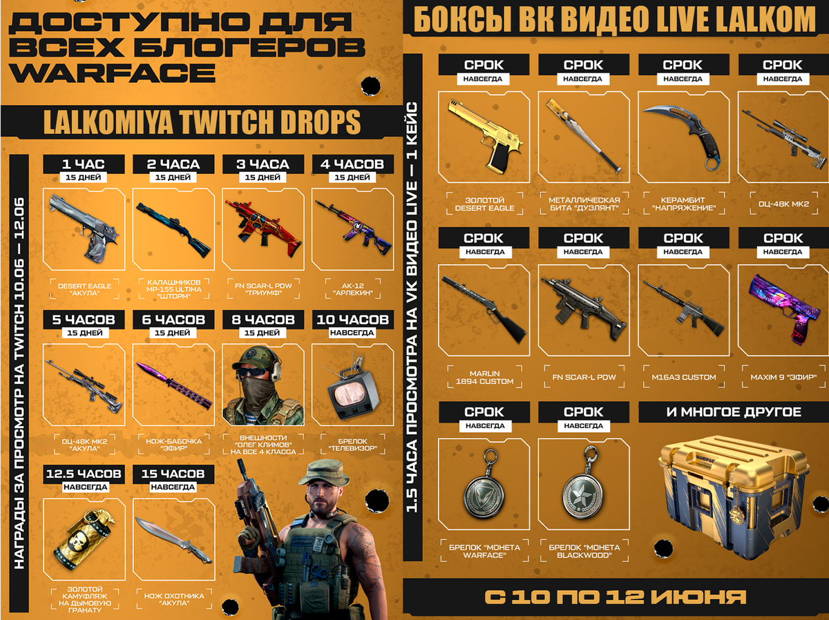 10–12 июня 2025 | Warface "Опасный аттракцион" Друзья! Сезон "Опасный аттракцион" в разгаре, и вместе с ним стартуют Twitch Drops и Бокс-кампания VK Видео Live! Смотрите трансляции Warface с 10 по 12 июня и забирайте ценные награды. 🔴 Twitch Drops Смотрите стримы с тегом #WarfaceDrops и получайте игровые трофеи! Как подключиться? 1️⃣ Авторизуйтесь на Twitch. 2️⃣ Привяжите аккаунт Warface по ссылке. 3️⃣ Смотрите участвующие каналы и следите за прогрессом в разделе Drops. 📦 Бокс-кампания VK Видео Live За каждые 1,5 часа просмотра — кейс с наградами! Что нужно сделать? ✔ Войдите в VK Видео Live через игровой аккаунт Warface. ✔ Смотрите стримы с меткой Warface в VK Видео Live. ✔ Забирайте кейсы в чате трансляции — они автоматически поступят в VK Play Маркет. 💡 Совет: Можно участвовать на обеих платформах одновременно и собирать вдвое больше наград! 📌 График активностей и список наград — в нашей инфографике. Не пропустите шанс получить эксклюзивные предметы! Устраивайтесь поудобнее, вы