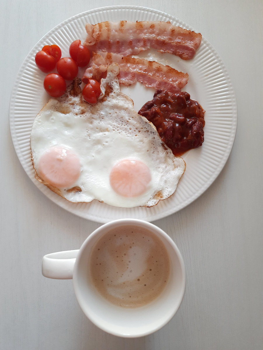 #Завтрак – обжариваю бекон. Вынимаю. И на оставшемся жире обжариваю 2 яйца в виде глазуньи. Помидорки черри и немного консервированной фасоли. Кофе со взбитым молоком.