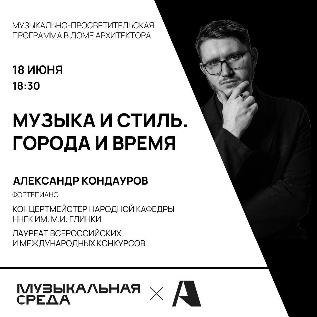 🎼 АЛЕКСАНДР КОНДАУРОВ — пианист, резидент Планетария-1 в Парке Швейцария, концертмейстер народной кафедры Нижегородской консерватории им. Н.И. Глинки. В 2023 году выступил композитором музыкально-поэтического спектакля «Творение» (режиссер А. Пинскер-Козинец). Также был задействован как аранжировщик в создании перформанс-сюиты «Интерстелар». В качестве пианиста выступает в спектаклях «Центра Театрального Мастерства» в Нижнем Новгороде. Участвовал во множестве фестивалей, среди наиболее известных — фестиваль «Столица закатов», Московский международный фестиваль «Эхо» и Всероссийский фестиваль «Видеть музыку» 18 июня в 18:30 в Доме Архитектора Стоимость билета — 500 рублей Верхне-Волжская набережная, дом 2 #яместный