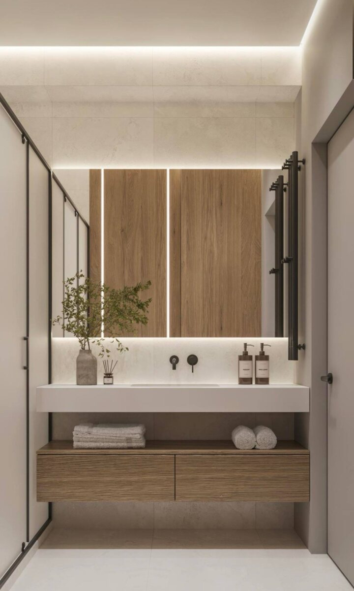 🪞Как выбрать зеркало в ванную? Сохраняйте советы и делитесь с друзьями Зеркало — это важный акцент, который влияет на восприятие пространства и интерьер. Если всё сделано грамотно — ванная комната становится просторнее, светлее и уютнее. А если наугад — получается не очень удобно, не очень красиво и «как будто что-то не то». Что учесть при выборе зеркала? ✔️Размер Зеркало = ширине раковины. Маленькая ванная — компактная модель. Просторная — можно большое или даже зеркало на всю стену. ✔️Форма • Круглое/овальное — мягче смотрится, добавляет уюта. • Прямоугольное — классика, визуально вытягивает помещение. • Нестандартная форма — если хочется «изюминки». ✔️Стиль Сейчас в тренде зеркала без рам. Но не забываем про классику с эстетичным обрамлением. Еще практичный вариант — когда зеркало встроено в шкаф. Смотрите визуализации, чтобы определиться, что по душе вам. P.S. на фото примеры из наших проектов. С вас 🔥, если было полезно) Потом не забудьте заглянуть СЮДА и получить беспла