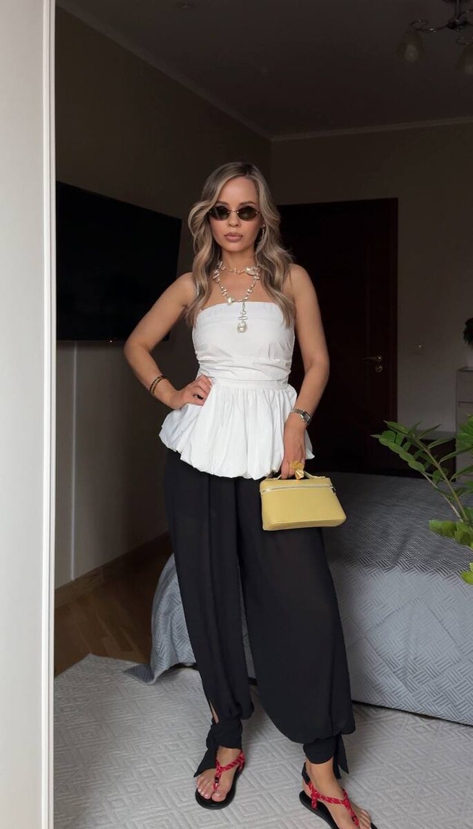 Идеальная формула для таких брюк: визуально сделать широкие плечи, сделать талию пояском или приталленый верх выбрать.