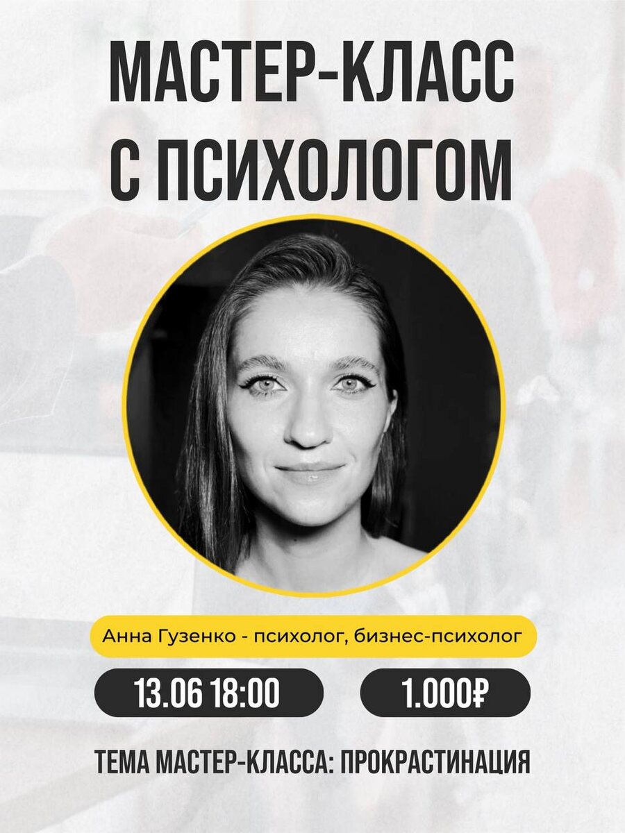 ✅ Прокрастинация. Все, что важно знать о прокрастинации - это не привычная лень, а фундаментальный способ жить. Это механизм, который не только помогает человеку, но и вредит ему. - Что же стоит за спиной прокрастинатора? - Что будет если перестать откладывать? ✅ И главный вопрос как это сделать? Борьбы с прокрастинацией на встрече не будет. Будет изучение ее через личные упражнения. Я надеюсь, что Вы найдете свой способ отношения к прокрастинации. ❤️ Приглашаю вас! ➡️ Для записи поставьте + в комментариях Однажды, мы уже проводили такое мероприятие и уже были готовы отменить его, потому что никто не записался, но потом нам пришлось искать зал больше, потому что все записались в последнюю очередь 😆 Адрес: Орджоникидзе, 43 Студия актерского мастерства |«ГРИМЁРКА»| Челябинск