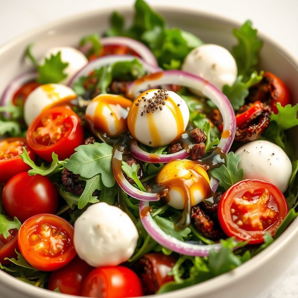 🥗 Салат с рукколой, моцареллой и вялеными томатами Ингредиенты (на 2 порции): - Руккола — 100 г - Моцарелла (лучше буффало) — 150 г - Вяленые помидоры (в масле или сухие) — 6–8 шт. - Черри — 10 шт. - Оливки без косточек — 50 г (по желанию) - Красный лук — ¼ луковицы - Оливковое масло — 2 ст.л. - Бальзамический уксус или соус — 1 ч.л. - Мёд — ½ ч.л. (можно заменить на щепотку сахара) - Соль, перец — по вкусу - Сушеный орегано или базилик — по желанию Способ приготовления: 1. Подготовь ингредиенты: - Моцареллу нарежь небольшими кусочками или шариками. - Вяленые помидоры порежь пополам, если они большие. - Черри разрежь пополам. - Лук нарежь тонкими полукольцами. - Рукколу промой и обсуши (можно слегка порвать руками). 2. Приготовь заправку: В миске смешай оливковое масло, бальзамический уксус, мёд, соль, перец и немного орегано. Перемешай до однородности. 3. Собери салат: В большой миске объедини рукколу, моцареллу, черри, вяленые помидоры, лук и олив