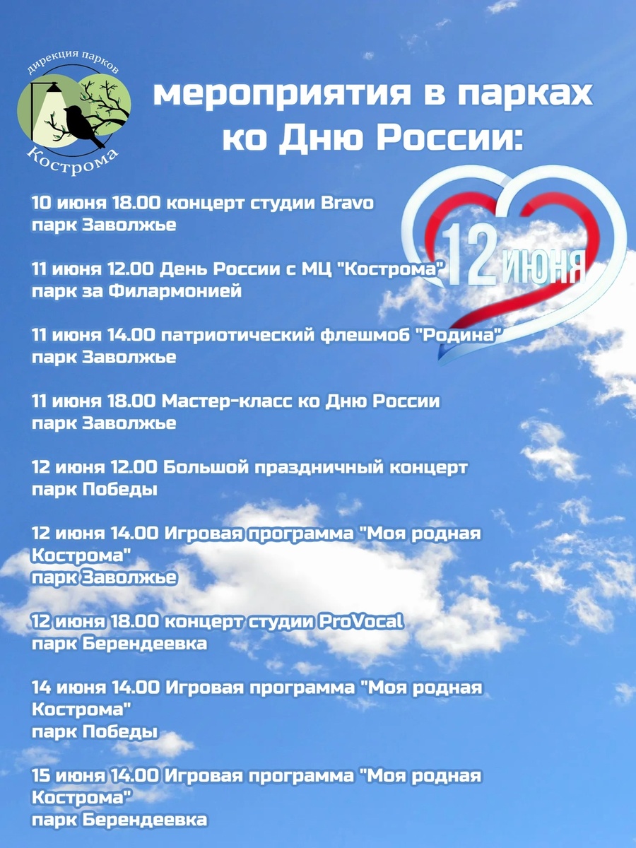 Программой праздничных мероприятий поделилась областная Дирекция парков 12 июня костромичи вместе со всей страной отметят День России. Программой праздничных мероприятий поделилась областная Дирекция парков. Фото: областная Дирекция парков Торжество начнется уже 10 июня. В шесть часов вечера в Заволжском парке состоится концерт вокальной студии «Bravo». 11 июня костромичей и гостей ювелирной столицы ожидают сразу три интереснейших события. В полдень костромской Молодежный центр подготовит развлекательные активности в честь национального праздника, всех желающих будут ждать в парке за Филармонией. Затем, в два часа дня стартует патриотический флешмоб. Насыщенная среда закончится мастер-классом, приуроченном к торжественной дате. Оба мероприятия проведут в парке «Заволжье». День России в областном центре начнется с большого праздничного концерта в парке Победы. В два часа в Заволжском парке организуют игровую программу «Моя родная Кострома». Спустя четыре часа горожане и туристы смогут н
