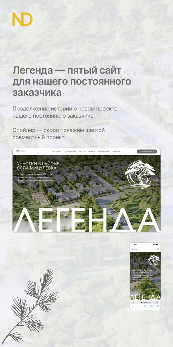 🎉 Новый кейс в портфолио ND — сайт проекта «Легенда»: загородные участки в районе села Мицулевка. Это уже пятый сайт, который мы сделали для этого постоянного заказчика — и совсем скоро покажем шестой. Работаем вместе не первый год и продолжаем развивать линейку digital-проектов для каждого нового объекта. В «Легенде» мы постарались сохранить атмосферу — природную, спокойную, живую. Гармония в ландшафте, чистая структура, лаконичный стиль, никаких визуальных перегрузов. 📱 Десктоп и мобильная версия — как всегда адаптированы и настроены на быструю конверсию: заявка на просмотр, геолокация, преимущества, галерея. Рекомендуем открыть с телефона — он ощущается именно так, как должен ощущаться современный сайт про землю и воздух. 👉 nedigital.ru/legenda