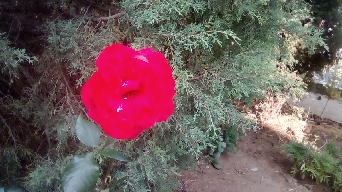 Во дворе есть старая высокая сосна, а на клумбе - ещё розовые и белые розы.
