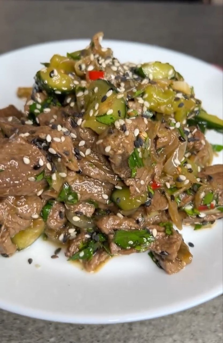 #САЛАТ С ГОВЯДИНОЙ И ОГУРЦОМ 🥒ПО-КОРЕЙСКИ 🌶 Ингредиенты: Говядина (вырезка) 300 гр. Огурцы 3 шт. Лук репчатый 1 шт. Соевый соус 3 ст. л. Рисовый уксус 1 ст.л. Масло кунжутное 1 ст.л. Масло подсолнечное 4 ст.л. Чеснок 4 зубца Перец 🌶 по вкусу Кориандр семена 1 ч.л. Кориандр молотый 1 ч.л. Кунжут 2 ст. л. Петрушка или кинза 1/2 пучка Соль по вкусу. Огурцы нарезать, посолить, выждать 20 минут и отжать влагу. Говядину порезать соломкой, обжарить 3 минуты, добавить кориандр, посолить. Лук порезать соломкой ,обжарить до коричневого цвета. Соединить огурцы, говядину и лук. Заправить соевым соусом, рисовым уксусом и кунжутным маслом. Нагреть растительное масло, обжарить в нем чеснок, острый перец и кориандр. Масло вылить на кунжут, добавить зелень, перемешать и убрать в холодильник минимум на 1 час. Приятного аппетита 💥🙌 Ваш вкусный шеф 🔪💥 https://dzen.ru/id/61f9fc43e12eb66e70d778ef