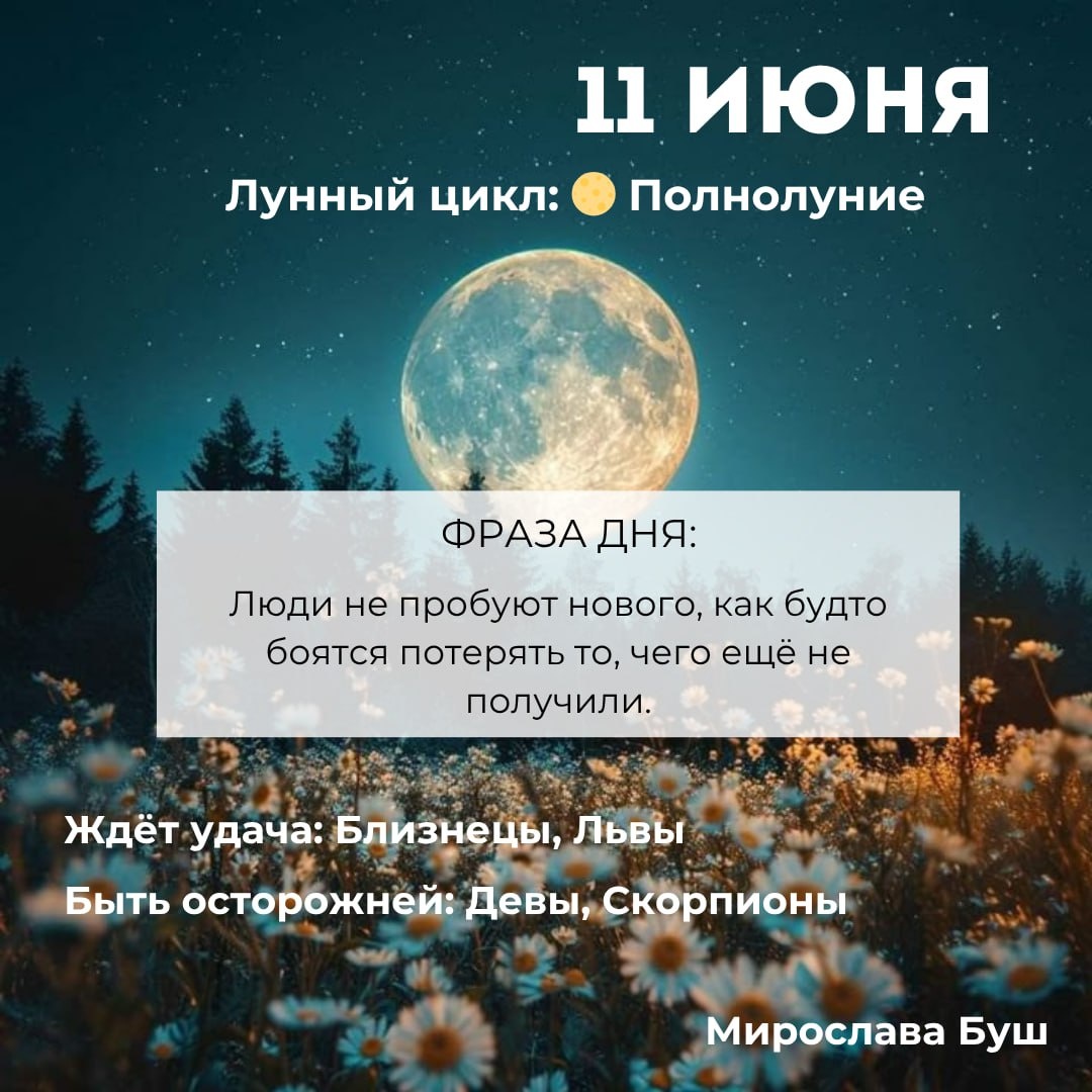 11 июня РЕКОМЕНДАЦИИ: 🌑 Луна в Стрельце. Знак любящий свободу и приключения. Поэтому готовьтесь к неожиданным поворотам и новым предложениям. 🧑⚖️ Хороший день для решения юридических вопросов. Всё, что связано с судами, документами, но только не земельными и строительными (Стрелец такого не любит). ❤️ Знакомства сегодня (романтические и деловые) подарят много новых эмоций, мечтаний и планов, но в итоге ничего толкового не принесут. ✉️ Подписаться на Мирославу #прогнознадень