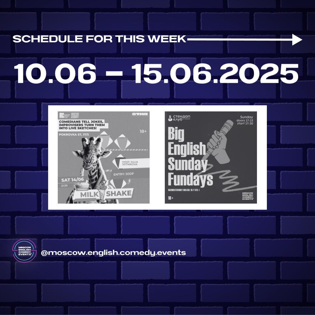 Schedule for this week (10.06– 15.06)❗️ -----‐----------------------- 🕤Saturday, June 14th, 9:30 PM – Comedy Milkshake 🥤Blend of improv and stand-up storytelling 👩🏼❤️💋👨🏻In partnership with Moscow Improv Club 💵Entrance: 500 rub 🔗 Buy tickets here 📍Still StandUp Moscow 🗺 Pokrovka 17c5, through the arch with the pink lights 🏙 Blue building directly inside the courtyard -----‐----------------------- 🕠Sunday June 15th, 5:30 PM - Big English Sunday Fundays 📺Special appearances by famous Russian comics 🎟️Entrance: FREE 💸 Donations welcome, one drink minimum 🔗Reserve for free 📍Stand Up Club на Трубной 🗺 Map: Rozhdestvensky Blvd, 10/7 С1