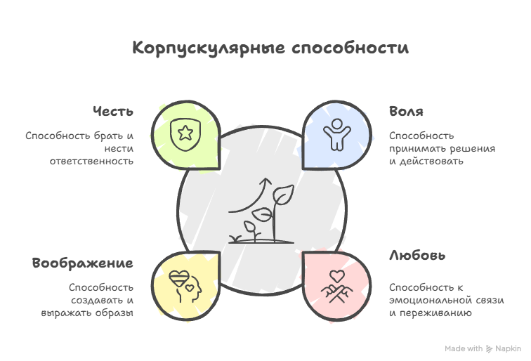Способности — это корпускулярные единицы сознания, проявляющиеся в конкретных действиях или решениях. Они могут быть направлены как вовне (экстраверсивно), так и внутрь (интроверсивно).