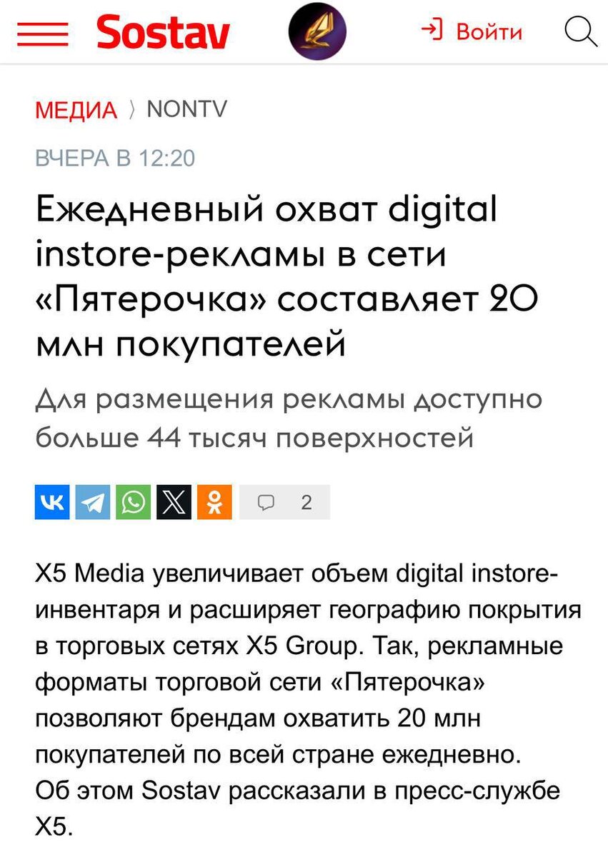Нормально X5 Media разогнались: digital instore-реклама в «Пятёрочке» теперь охватывает до 20 млн покупателей ежедневно