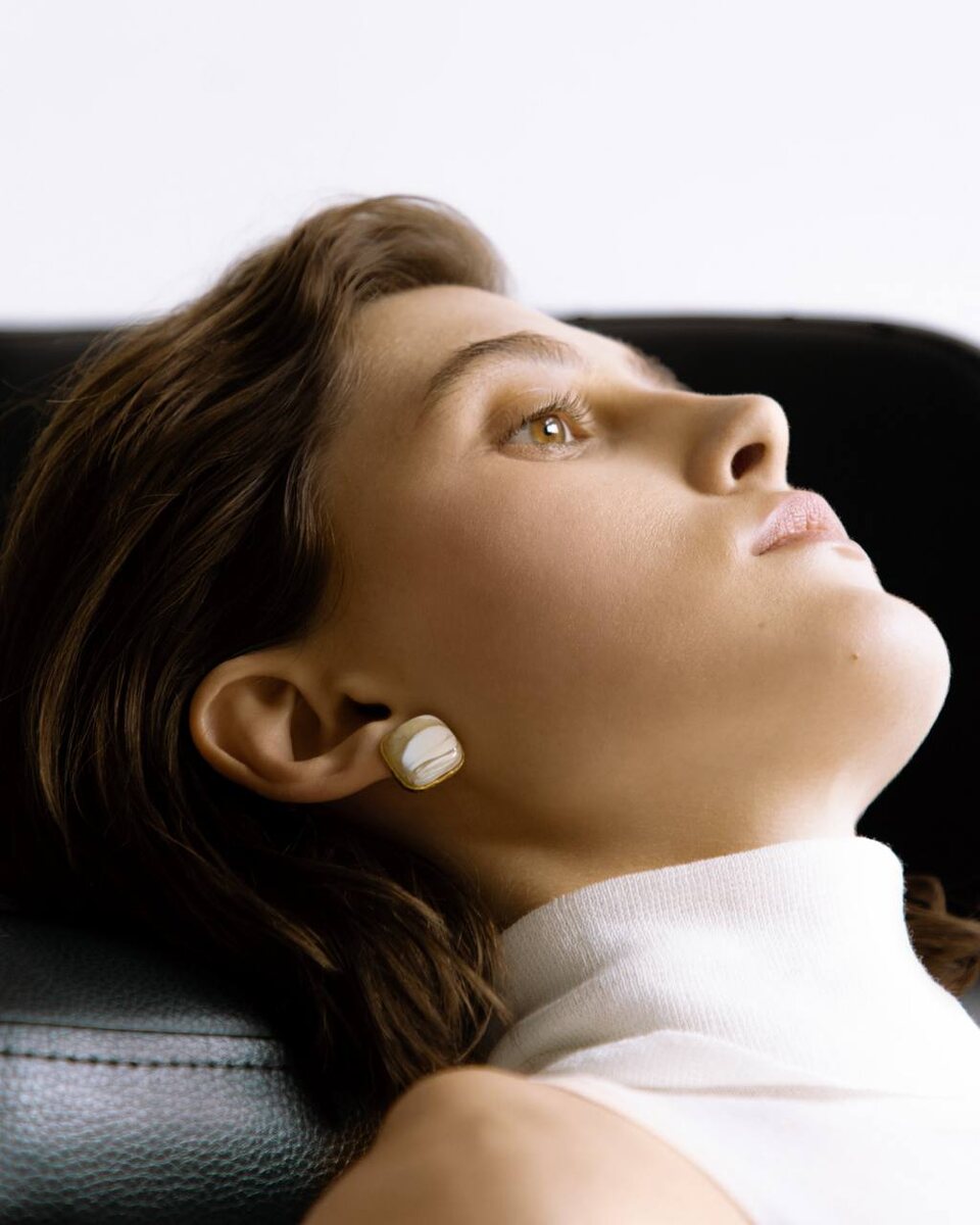 серьги в широкой оправе (как моносерьги), в текстурных оправах и, наооборот, в гладких, и, конечно же, в разных цветах металла: глянцевом серебре и матовом позолоченном серебре.