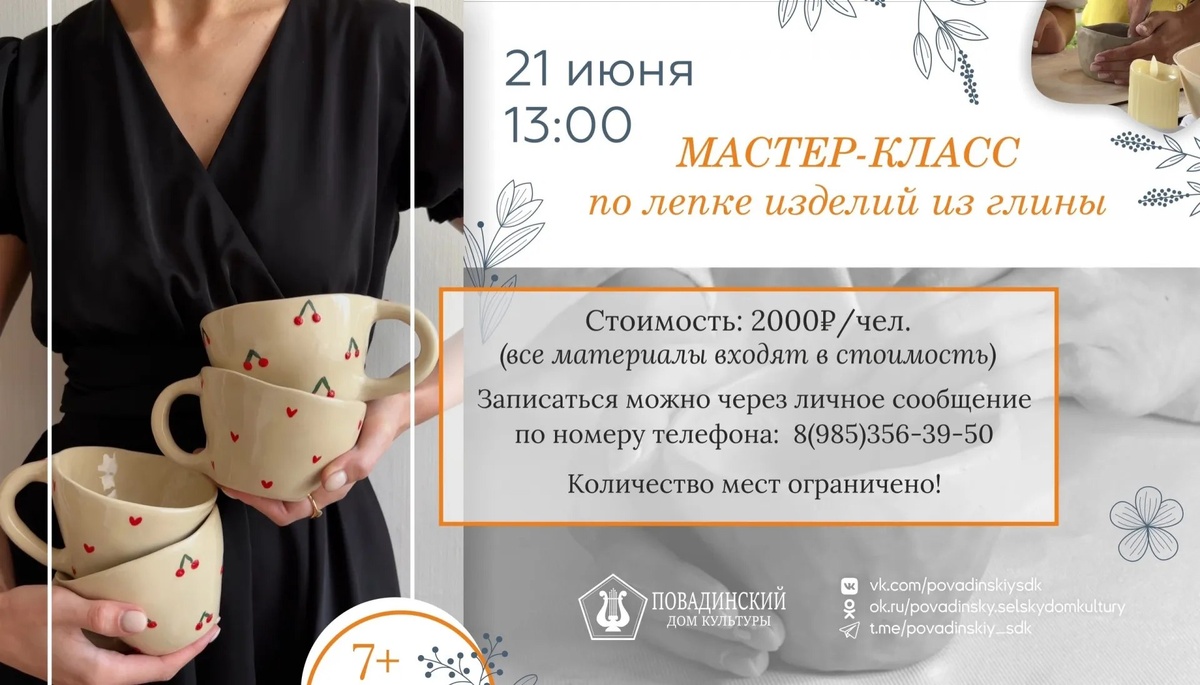 ✨ ☀️Вдохновляйтесь вместе с нами! Мы приглашаем всех желающих на мастер-класс по лепке изделий из глины. Мастер Ульяна, автор и создатель бренда Ilinia ceramics, научит вас реализовывать в жизнь свои творческие идеи☀️ ❗️Внимание! Места ограничены Записаться можно по телефону👇 8(985)-356-39-50 ЦЕНА: 2000 руб. (Все материалы входят в стоимость) 📆 21.06.2025🕒13:00 🏢 Повадинский сельский дом культуры (СДК) 📍 г.о.Домодедово, с.Вельяминово, 10, Центральная площадь ✅ Мероприятия Домодедово https://dzen.ru/id/66f10385cc4c5a16f7b5fb02 http://vk.com/domodedovo_events http://dzen.ru/domodedovo_events