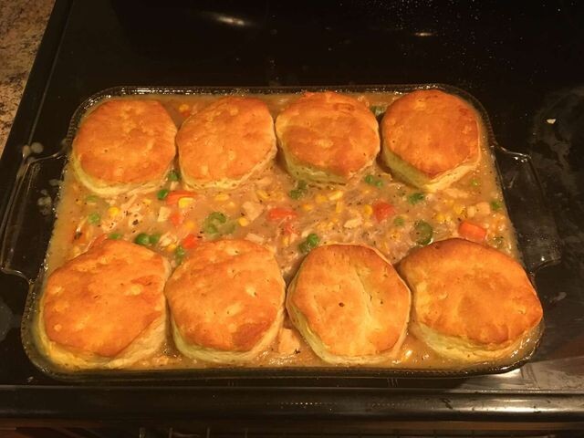 Запеканка из курицы и печенья Нечто среднее между традиционным куриным пирогом и курицей с клецками. ⌛ Подготовка: 30 мин. ⏰ Приготовление: 1 час. 10 мин. 🍴 Количество: 6 порций Ингредиенты ✅ ¼ стакана сливочного масла ✅ 2 зубчика чеснока, измельченного ✅ ½ стакана измельченного лука ✅ ½ стакана измельченного сельдерея ✅ ½ стакана измельченной детской моркови ✅ ½ стакана цельной муки ✅ 2 чайные ложки белого сахара ✅ 1 чайная ложка соли ✅ 1 чайная ложка сушеного базилика ✅ ½ чайной ложки молотого черного перца ✅ 4 стакана куриного бульона ✅ 1 (300 гр) банка гороха, 4 чашки нарезанного кубиками вареного куриного мяса ✅ 2 чашки смеси для выпечки на пахте ✅ 2 чайные ложки сушеного базилика ✅ ⅔ чашки молока Инструкция приготовления 1. Разогрейте духовку до 175 градусов C. Слегка смажьте жиром форму для выпечки 9х35 см. 2. В сковороде растопите масло на средне-высоком огне. Обжарьте в масле чеснок, лук, сельдерей и морковь до мягкости, помешивая. Добавьте муку, сахар, соль, 1 ч