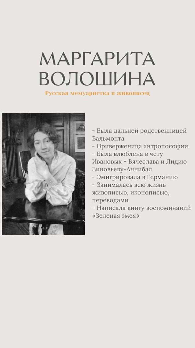 Маргарита Волошина — жена, муза, живописец и философ. Она вела беседы со Львом Толстым, изучала живопись под руководством Ильи Репина и Константина Коровина, дружила с Вячеславом Ивановым и Андреем Белым, была знакома с К. Бальмонтом, Н. Бердяевым, В. Маяковским, М. Чеховым и другими деятелями Серебряного века. #Персоналии