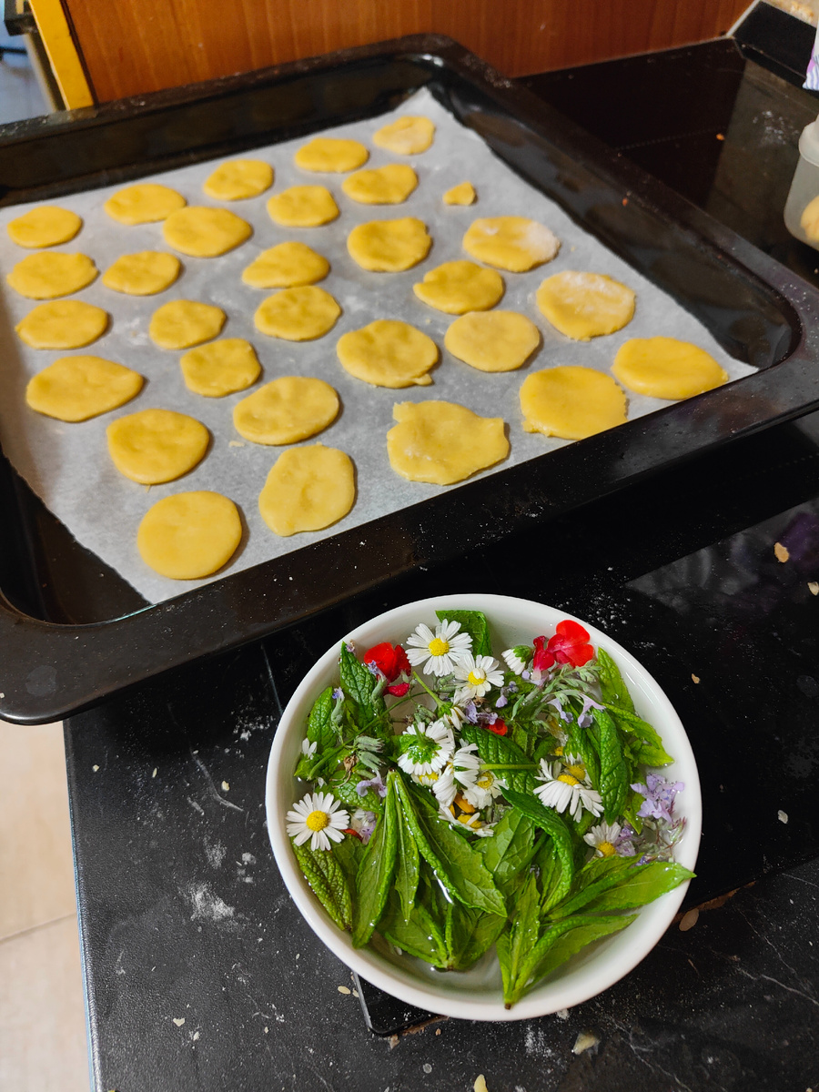Ну вот и настали летние каникулы! Теперь можно перевести дух и переставить будильник на более позднее время. (А некоторым вообще будильник до сентября не потребуется!) Увы, каникулы нашего школьника в этом году начались с травмы. Он неудачно прыгнул на тренировке и в результате повредил ногу. Ввиду того, что на костылях в футбол не проиграешь и с друзьями не погуляешь, пострадавший сидит дома и отчаянно скучает. В этой связи, нужно было что-то придумать, чтобы хоть как-то развлечь ребёнка и дать передохнуть телевизору. Я предложила ему сделать гербарий из июньских цветов, дико и культурно произрастающих в нашем саду. Сын настаивал на чём-нибудь вкусненьком. В результате мы пришли к консенсусу и решили приготовить съедобный "гербарий": печенье, украшенное настоящими цветами. Сказано - сделано! Получилось очень красиво и аппетитно. Для украшения печенья были использованы цветы настурции, календулы, декоративного шалфея, анютины глазки, листочки мяты, а также сухая смесь лепестков кули