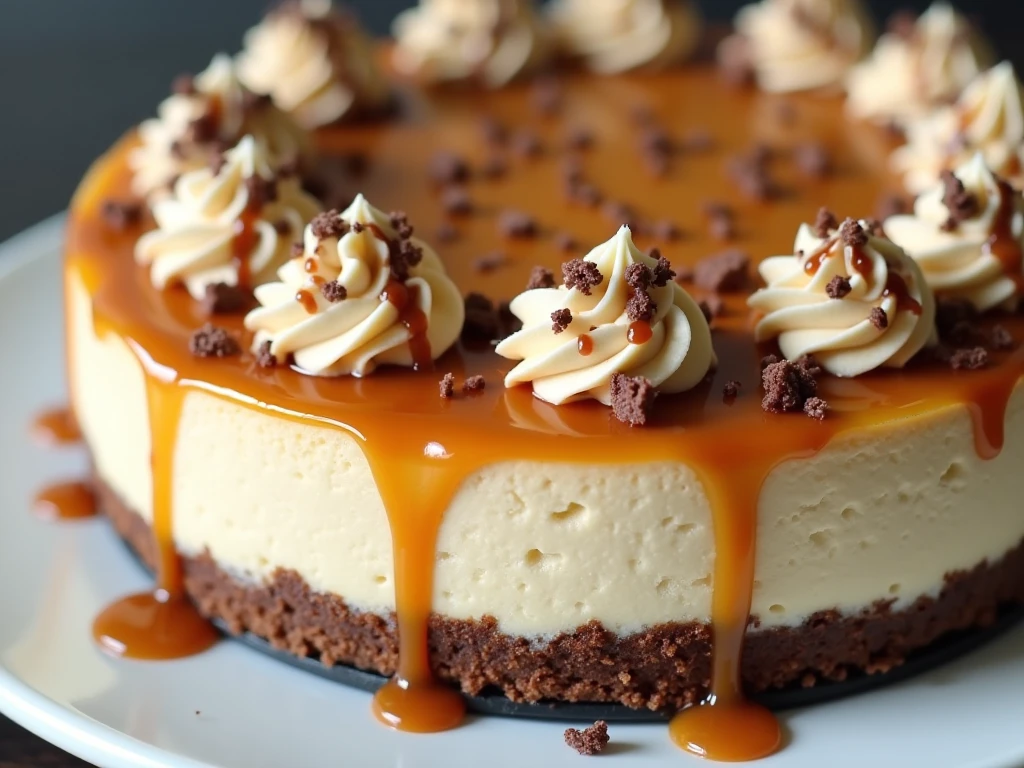 Ванильный экстракт — 1 ч. л. Для карамели: сахар — 100 г, сливки — 50 мл, масло — 30 г, щепотка соли Для украшения: взбитые сливки, карамельный и шоколадный соусы Берём любимое шоколадное печенье и превращаем его в мелкую крошку — я обычно использую блендер. Растапливаем сливочное масло, смешиваем с крошкой и утрамбовываем массу в разъёмную форму. Получается плотная, ароматная основа с характерной шоколадной горчинкой. Убираем в холодильник, чтобы она хорошо схватилась. В глубокой миске взбиваем творожный сыр с сахаром до воздушности — пусть масса станет шелковистой и гладкой. По одному вводим яйца, не перестава