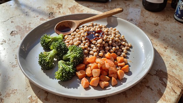 Отварите соевые бобы и брокколи на пару. Морковь нарежьте тонкими полосками и обжарьте на маленьком огне. Смешайте все ингредиенты и заправьте соевым соусом. Получается питательно, вкусно и идеально для ужина. Калории: около 150 ккал.