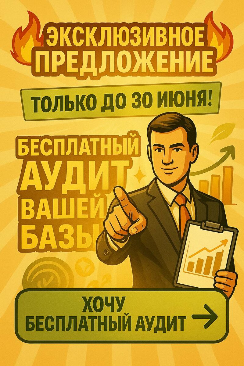 🔥 Эксклюзивное предложение только до 30 июня! 🔥 Скоро отчётный период — и если вы не хотите тратить нервы, время и деньги на исправление ошибок, вам нужно действовать прямо сейчас! 💥 Только у нас — бесплатный аудит вашей базы, который реально поможет подготовиться к отчётности без стресса и штрафов. Почему это 🔥ВАЖНО🔥 именно сейчас? 🚀 Такой акции ещё не было — бесплатно и без подвоха 🚀 Мы внимательно проверим вашу базу 🚀 Вы получите рекомендации, как избежать ошибок и на что обратить внимание 🚀 Это экономия времени, сил и — главное — уверенность, что вы не упустили ничего важного ⏳ Акция действует только до 30 июня! Потом — по обычной стоимости. 👉 Записаться на бесплатный аудит можно здесь: @ChurCons Не откладывайте. Сейчас — самое время навести порядок. Мы рядом, чтобы сделать отчётный период спокойным.